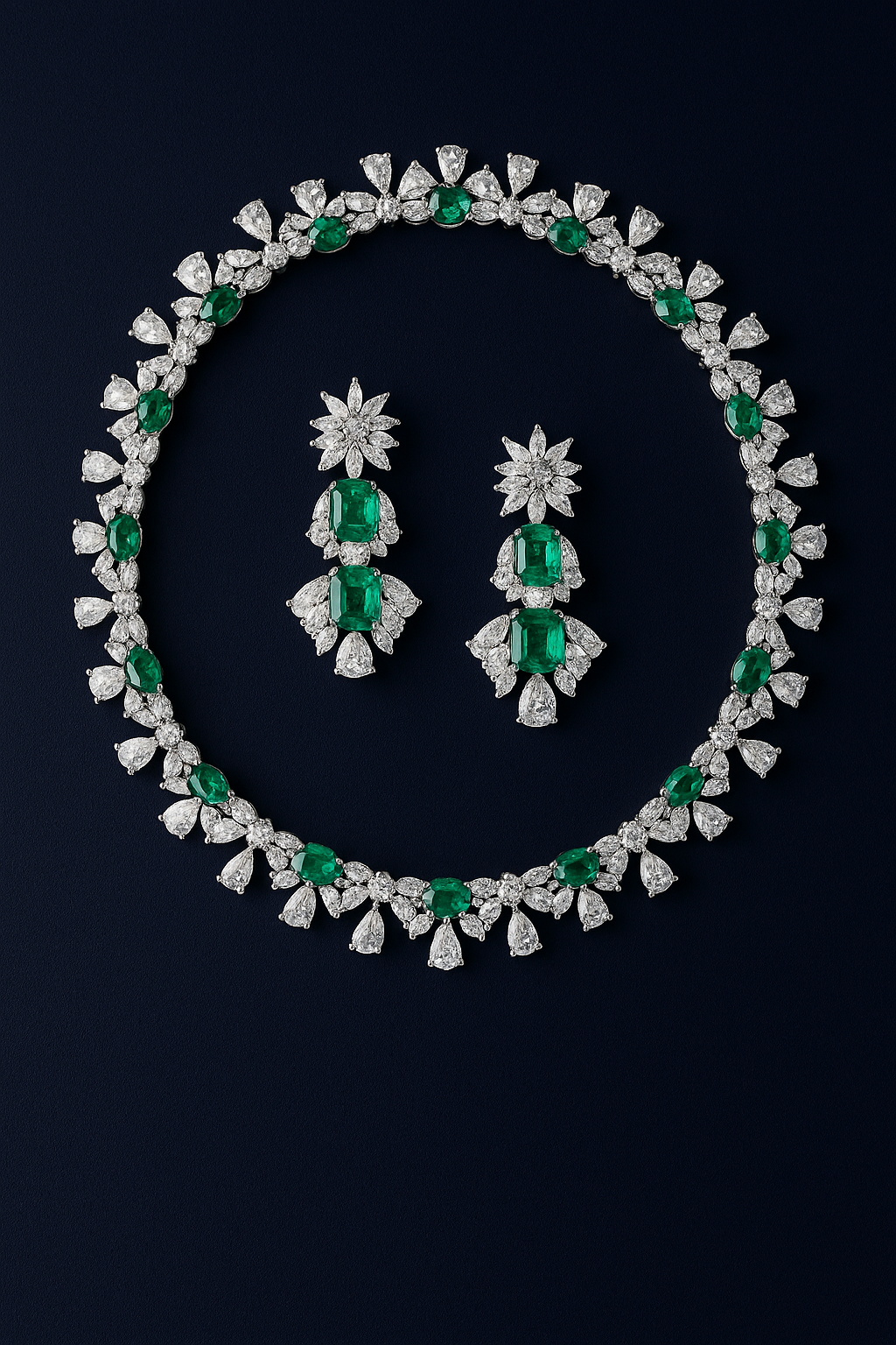 A luxurious jewelry set consisting of a necklace and earrings with an elegant flower-inspired design, adorned with sparkling cubic zirconia stones and synthetic emerald gems in rich green tones.